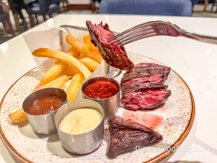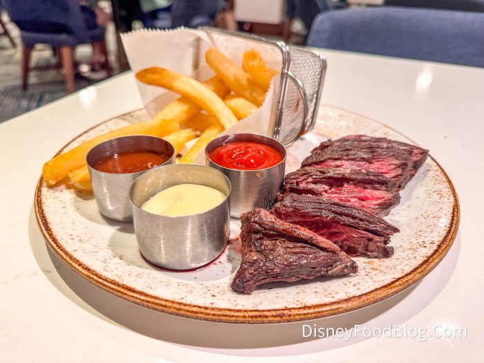 The menu is extensive and leans hard into luxury, with premium cuts of beef, seafood, and rich sides designed for sharing. This isn’t the spot for budget dining, but if you’re looking for one of the best steak experiences anywhere on Disney World property, Bourbon Steak delivers. Even before the main courses arrive, the experience feels elevated, starting with a complimentary fry trio that sets the tone for how thoughtful and indulgent the meal is going to be.