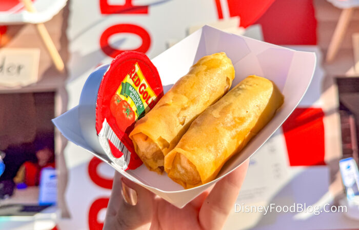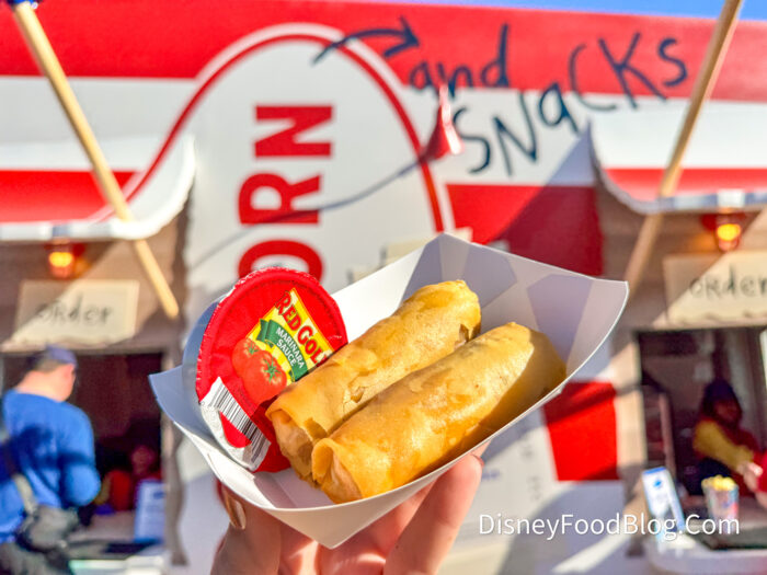 Of course, we had to put the new spring rolls to the test! If you’re familiar with the Pepperoni and Cheese Spring Rolls in Magic Kingdom, these are pretty similar. These weren’t super greasy (which we loved), and they were stuffed with pepperoni.