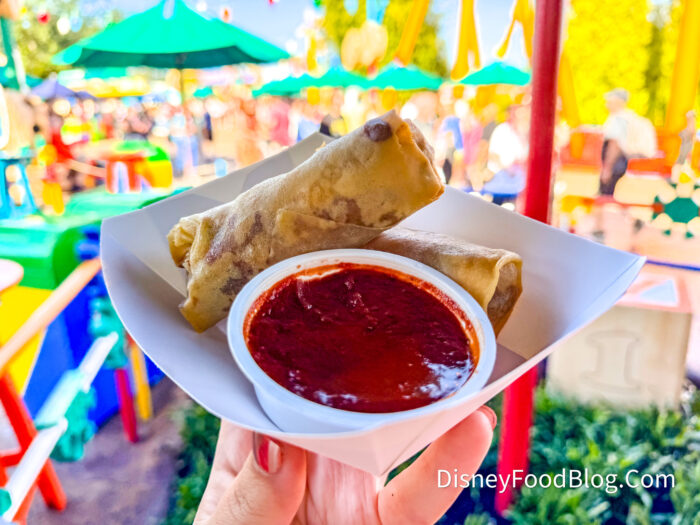 Yes! This menu is bringing Spring Rolls to Toy Story land, which we are seriously excited about. There will be two pepperoni pizza spring rolls with a marinara dipping sauce for $9.49. The menu does note they won’t be available until 10:30 AM each day.