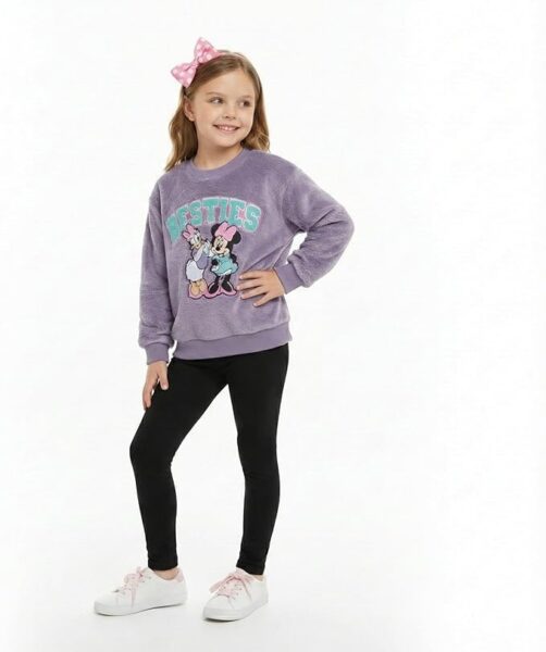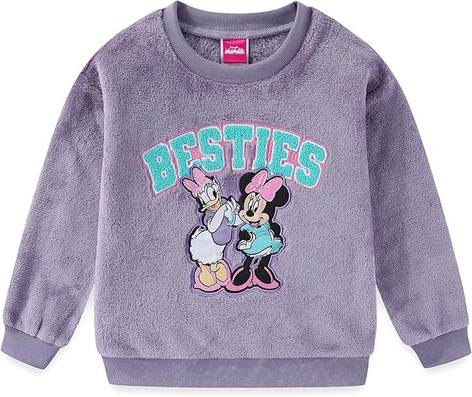 This one’s technically for kids, but let’s be real, the design is so cute. The purple crewneck features Minnie and Daisy standing side to side in an embroidered/patch style graphic. Above them is “BESTIES” in big fuzzy teal letters outlined in pink. It has ribbed cuffs and a hem that make it comfy and warm for cooler days. If you’re planning a Disney trip with a little one, this is such a fun addition.