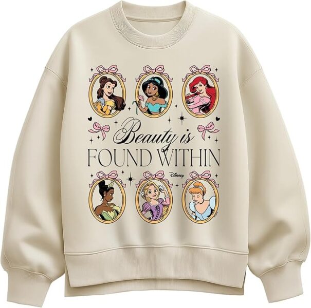 If you love vintage-inspired Disney designs, you’ll love this one. The front features a grid of six princesses, including Belle, Jasmine, Ariel, Tiana, Rapunzel, and Cinderella, all in vintage-style oval portraits. Each portrait is framed in gold with pink coquette ribbon bows on top. In the center, the text reads “Beauty is FOUND WITHIN” in a mix of elegant script and serif fonts. It’s oversized, cozy, and feels very on trend right now.