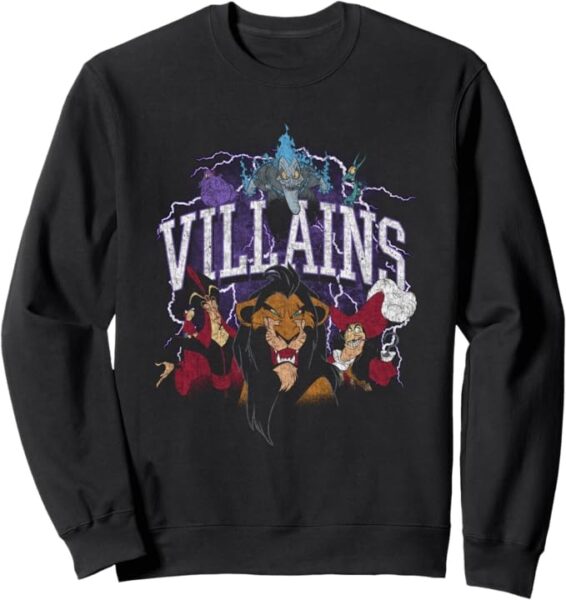 Villains fans are going to love this. The sweatshirt features a collage of iconic villains like Jafar, Scar, Captain Hook, Hades, and Pain and Panic. The purple lightning background gives it that dramatic flair, and the distressed white “VILLAINS” text really pulls it all together. It feels edgy in the best way and is perfect if you’re more Team Villains than Team Princess.