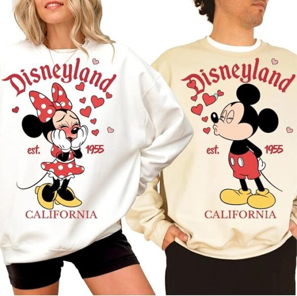 This one is already screaming matching park photos. It’s technically two different sweatshirts that are meant to be worn together, and the design is adorable. Minnie’s on a white sweatshirt, blushing, while Mickey’s on a cream one, blowing kisses. The floating red hearts connecting the two make it extra cute without being over the top. The arched Disneyland text with “est. 1955” and California underneath gives it that classic Disney vibe. Perfect for Valentine’s Day, anniversaries, or honestly any trip where you’re coordinating outfits.