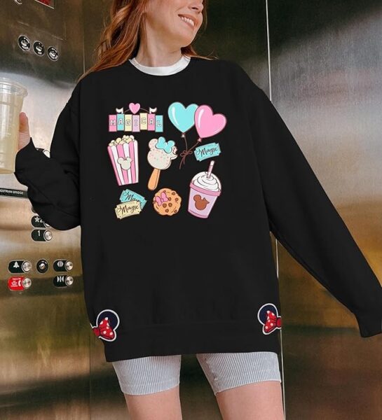 This sweatshirt is basically a love letter to Disney snacks. Front and center, you’ve got popcorn, a Mickey ice cream bar, a Mickey cookie, a pink Starbucks-style drink, park tickets, and balloons. It’s also got a pair of Minnie ears patches on the bottom hemline. It’s playful, cozy, and very on brand for a park day.