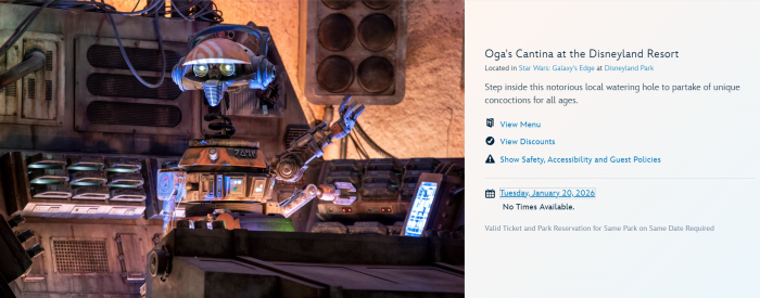 However, note that if you were planning on visiting the bar during that time, it’s not showing hours for it, so you won’t be able to. Also, Oga’s Cantina stopped taking advance reservations last year and now has walk-up availability and a standby line. Pro tip: if you want to get in with a short wait, go earlier in the day, as in the morning. On most days, you’ll find mornings mean you might not have to stand in line at all.