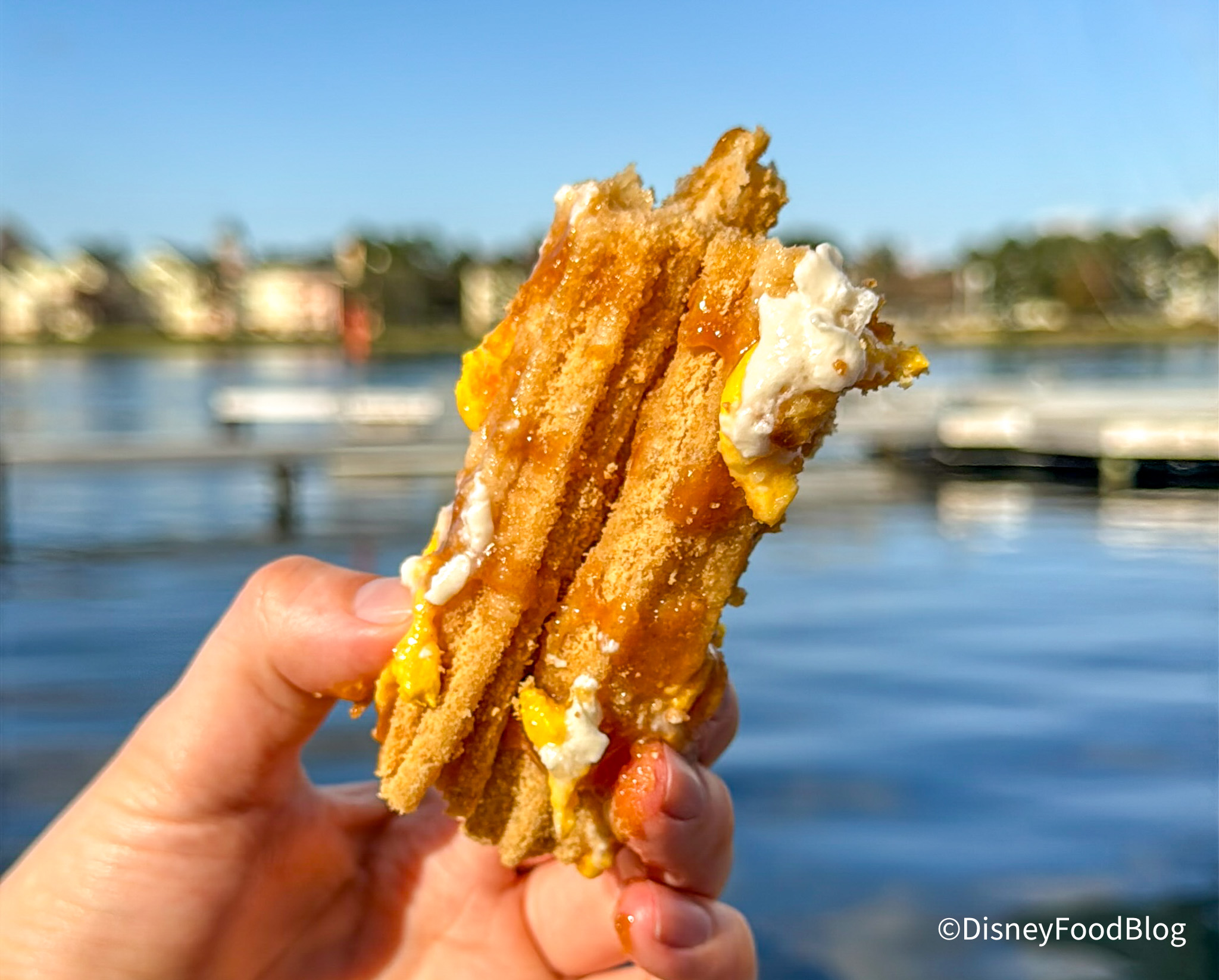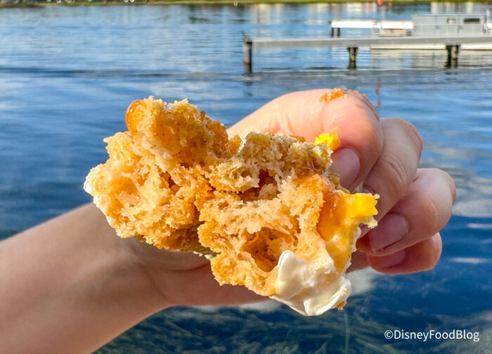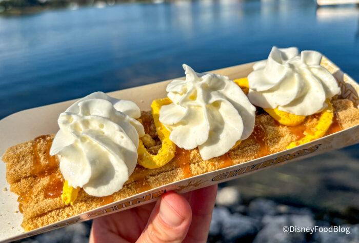 The churro was on the dry side, which Disney World churros can be — it tasted like it had been sitting out for a while. While we didn’t love this, if you like that artificial banana flavor of Laffy Taffy, you will probably like this. We probably wouldn’t get it again, as the churro was dry and the banana flavor was a bit overpowering. In theory, these flavors work together, but the artificial banana flavor really just threw things off for us.