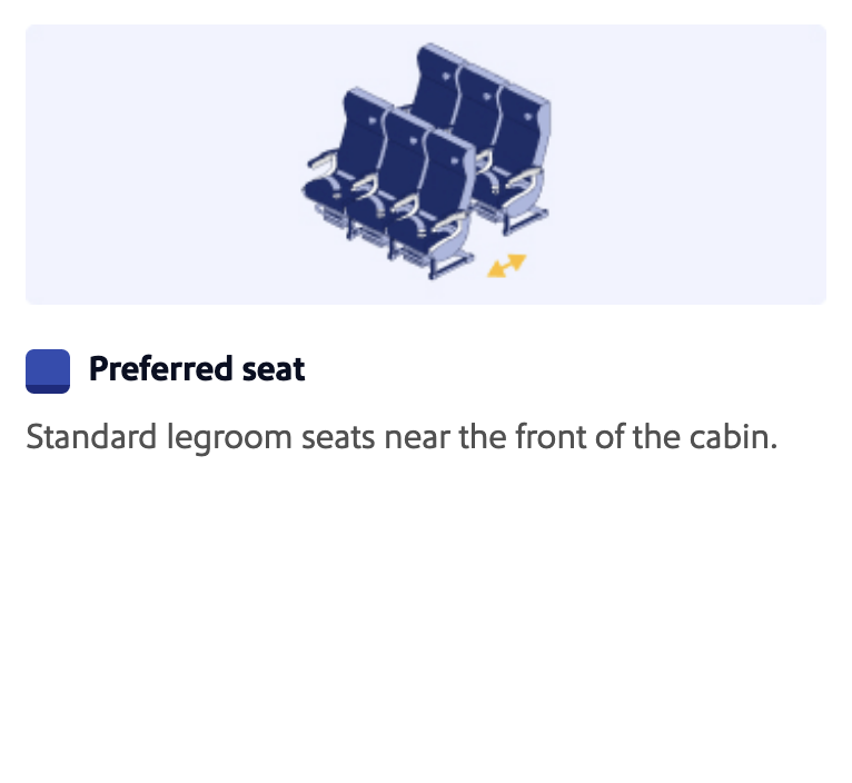 - A Preferred or Standard seat you select at booking (an Extra Legroom seat will cost extra)