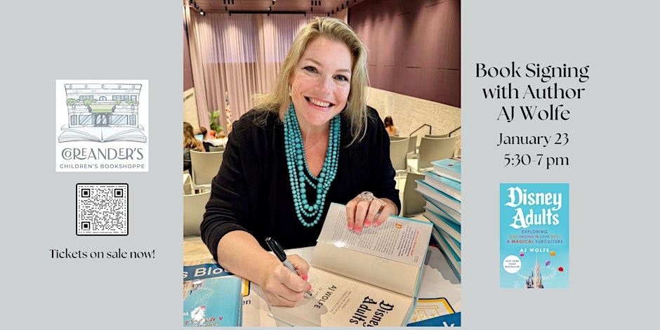 There will be four chances on January 23rd to meet AJ at Coreander’s Children’s Bookshoppe and get a signed copy of Disney Adults: 1:30 PM, 3:30 PM, 5:30 PM, and 6:15 PM. The 5:30 PM and 6:15 PM events are sold out, so you’ll need to grab tickets ASAP, though, before the other signing events are full!