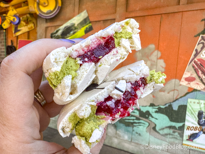 This macaron is filled with raspberry gelee and matcha buttercream. The raspberry is the most prominent flavor in this treat, although you can also taste the matcha. It is not overly sweet, which we think is perfect for the flavor combination.