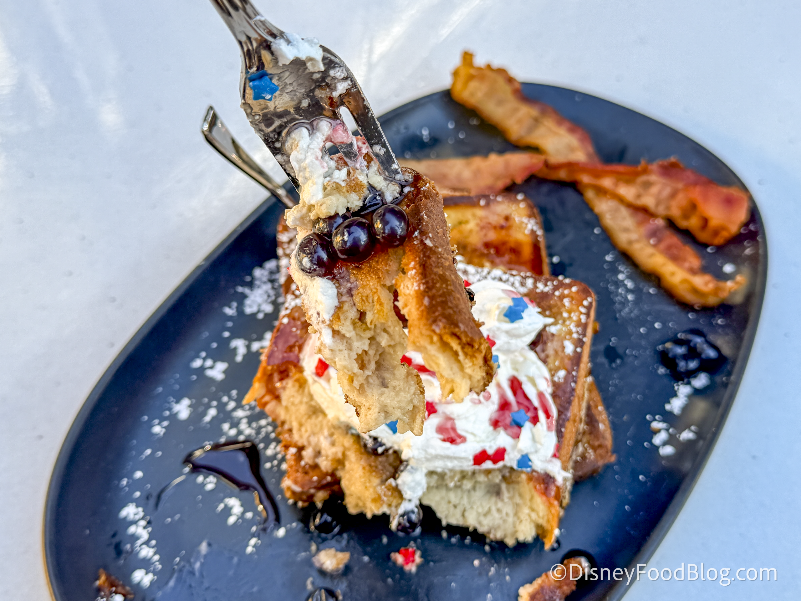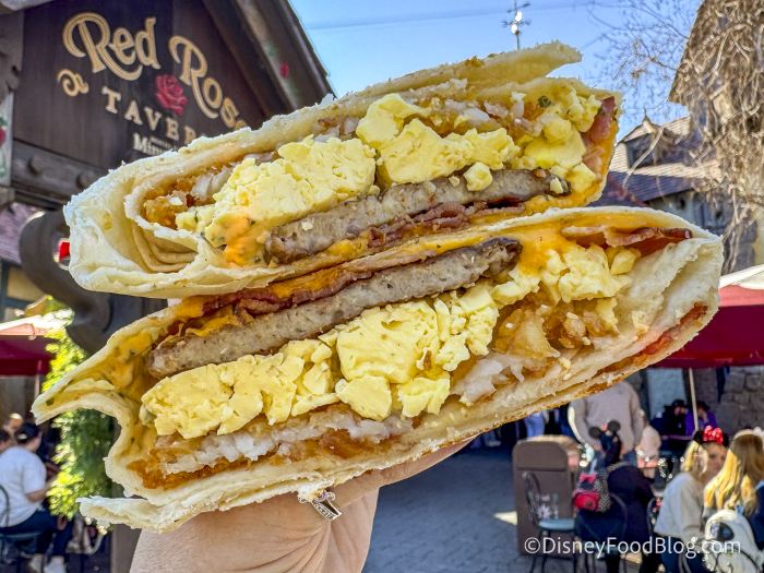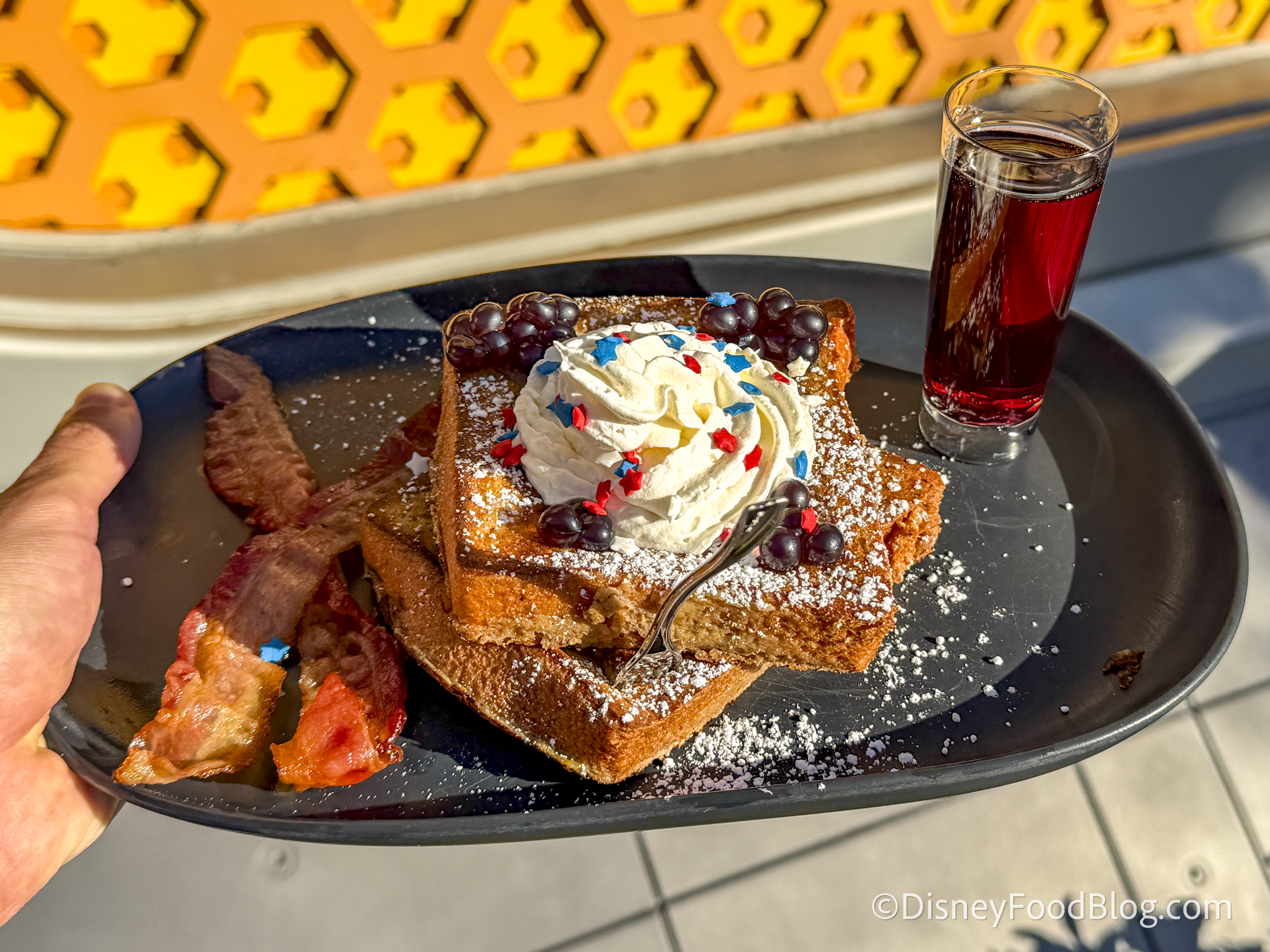 The Formulated French Toast features bacon, blueberry-flavored popping spheres, Jamaica syrup, whipped cream, and sprinkles. We probably wouldn’t say this is our favorite breakfast option on Disneyland property. The bacon was the best part; it wasn’t too chewy and had a mix of smoky and savory flavors.