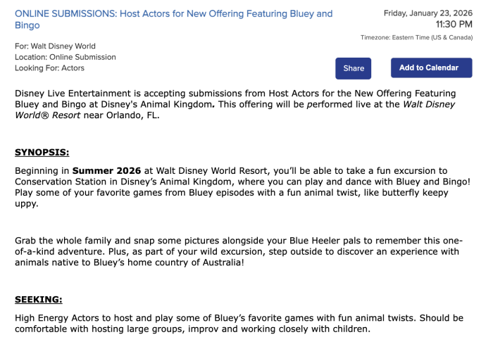 Yesterday, we saw Disney file a new permit for the park that very well could be for the new Bluey experience coming to the Conservation Station later this year, and now, there’s a new casting call that caught our eye, too. It looks like Disney is searching for actors to bring this new Bluey and Bingo experience to life, and it gives us more of an idea of when we can expect to meet these beloved characters!