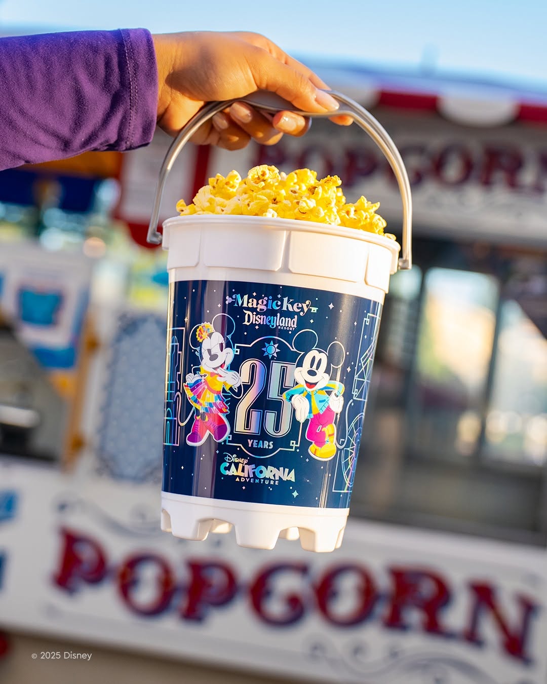 Meanwhile, over in DCA, the Disney California Adventure Park 25th Anniversary Bucket will also become available to Magic Key Holders soon, and will be found at popcorn carts around Disney California Adventure. This bucket is navy blue and white and features Mickey and Minnie in their bright, neon outfits next to a silver 25.