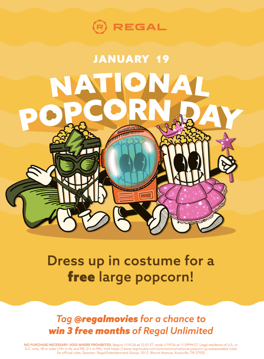 National Popcorn Day is January 19th, and if you head to participating Regal Cinemas dressed as ANY character you’d like (just be prepared to tell the cashier who you’re dressed as!), you’ll get free popcorn! Yes, that means you could come dressed as your favorite movie or TV character, popcorn itself, or anything else your mind can think of!
