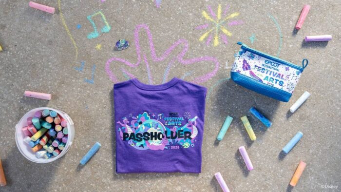 Disney dropped a new photo on the Disney World Annual Passholder page of its website with a peek at the new EPCOT Festival of the Arts Annual Passholder t-shirt, as well as a zipper pouch and pin. The t-shirt is purple with artsy swirls behind the festival logo. Of course, Figment is on there, too! The zipper pouch is blue and white with the festival logo. The pin has a similar swirly design to the t-shirt. Take a look: