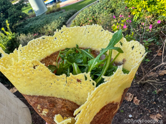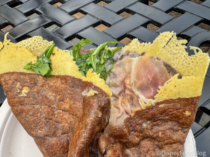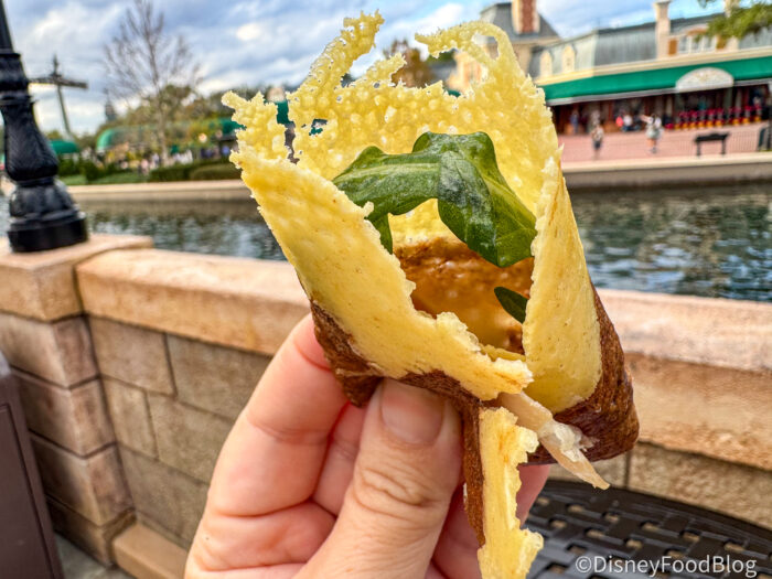 You’ll find it at Crêpes À Emporter by La Crêperie de Paris (the quick service window offering up some of the most delicious sweet and savory snacks in all of Disney World) for $15.95, and honestly, it’s worth stopping for even if the line looks intimidating. This is a savory galette, and it’s filled with cheese, mushrooms, ham, and arugula — BUT the way these flavors come together is what makes it special!