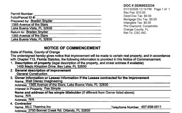 The address on the Notice of Commencement (1455 Magic Kingdom Drive, Bay Lake, FL 32830) is the address for Keel Boat Landing in Magic Kingdom. Keel Boat Landing is the building in front of the Haunted Mansion entrance. While there are quite a few construction walls up in this area, Keel Boat Landing is usually used as an extended queue for Haunted Mansion. Prior to that, it was the entrance to the “Mike Fink Keel Boats” attraction in Magic Kingdom, inspired by the film, Davy Crockett and the River Pirates.