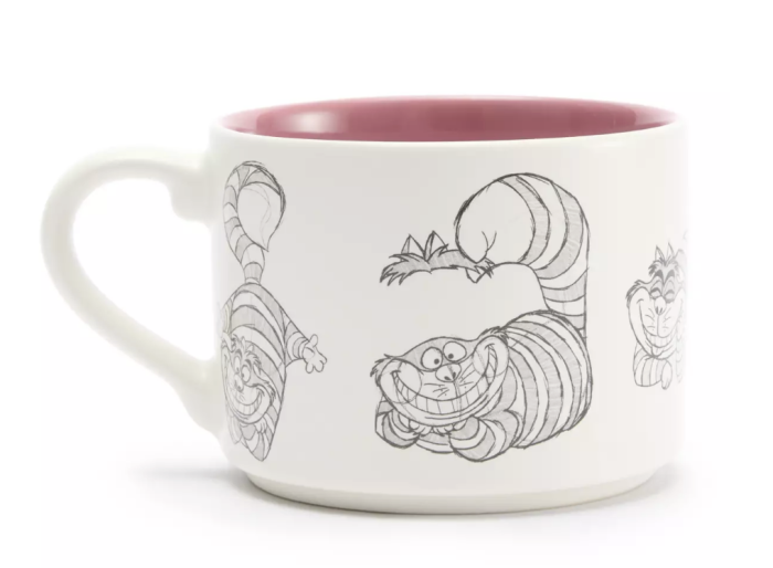 Sometimes, a little mischief is good, and that’s exactly what the Cheshire Cat brings to the party! In the Cheshire Cat Animation Mug, you can see him in different stages of animation, bringing him to life right before your eyes. The outside of the mug is white, with his animation lines in black, but the inside of the mug is pink to match his coloring.