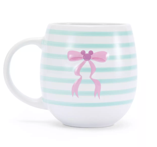 Want something classic, but still beautiful to add to your cabinet? Look no further than the Mickey Mouse Icon Rose and Ribbon Mug, which is cute as can be! The mug itself is white with light teal blue horizontal lines, and a pink Mickey bow on one side, and a bouquet of beautiful pink roses on the other. It’s great for any time of year!