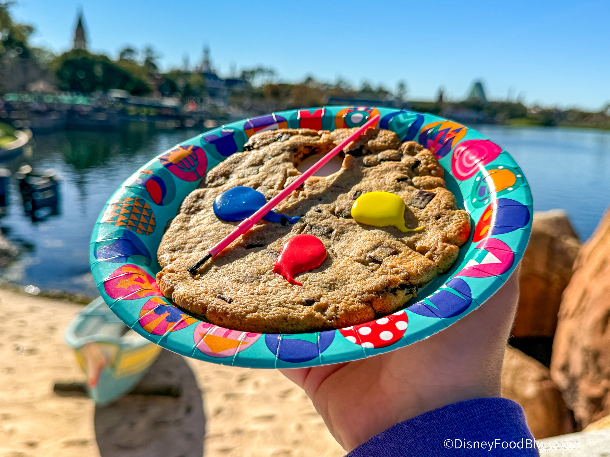 Head to Refreshment Outpost to get the item that we’re deeming “best for kids” at the 2026 Festival of the Arts! This is the Artist Palette Jumbo Chocolate Chip Cookie for $5.79 and it’s as entertaining as it is yummy.