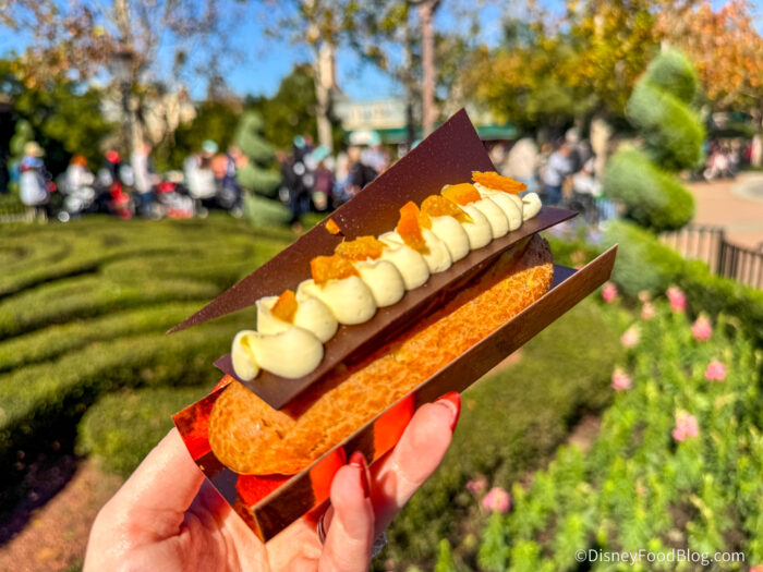 At L’Art de la Cuisine Francaise in the France Pavilion, there are two delicious dishes we want to highlight. The first one is a new item, named literally, “Éclair au Chocolat et à l’Orange, Crème à l’Orange, Ganache au Chocolat, Croustillant de Noisettes et Oranges Confites.” Long, right?!
