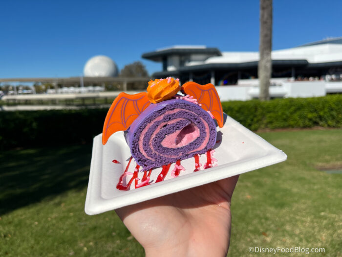Starting our list of best new items for 2026 is Figment’s Fantasy Cake, available at Figment’s Inspiration Station at the Odyssey Pavilion. This is a sponge cake filled with strawberry whipped cream, topped with a white chocolate ganache, orange icing, and white chocolate Figment wings for $5.79.