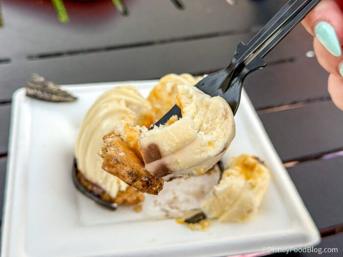 The apricot jam cuts through like a bright little sunbeam, bringing tangy stone-fruit pop and keeping the caramel from turning the whole thing into a sugar blanket. Under it all, the hazelnut cookie adds roasted, nutty crunch with a hint of praline, plus that slightly buttery, toasty finish. It’s almost like coffee in a dessert. This is the best way to end your eating journey at the EPCOT Festival of the Arts, y’all. It’s…well…perfect.