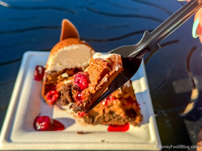 We were a little worried this dessert would melt, but it held up very nicely. The chocolate mousse is addictive; we went through it so fast. The cream on top reminds us of whipped cream when we got into it. The cherries are cooked through the mousse, and remind us of a black cherry — sweet and tart. We’re telling you, this is a must-grab, this dessert is DELICIOUS!