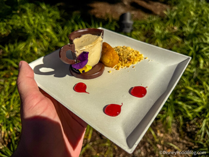 An adorable Twinings Earl Grey Tea Treat Chocolate Pot de Crème is presented with a lemon madeleine, rose and raspberry jam, and a tea biscuit crumble. The presentation is delightful and visually striking, making it an ideal choice for photo-worthy moments. Despite initial hesitation from our reporter, who is not typically a tea drinker, the dessert proved to be beautifully balanced. The Earl Grey notes were subtle and approachable, complementing the sweetness without overpowering the dish. Overall, this was a standout offering, both in flavor and presentation, and an excellent option even for those who don’t usually order tea-infused desserts.