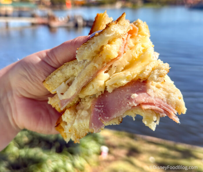 We ordered the all-new Croque Monsieur-inspired Grilled Cheese with Black Forest ham, Gruyère, and béchamel sauce served with tomato soup for $6.79 (or a snack credit on the Disney Dining Plan). This is a really interesting grilled cheese. Although the bread has a crispy exterior like a traditional Croque Monsieur, it doesn’t have the melted cheese on top of the bread. But you do get melted cheese inside, and it’s SUPER gooey.