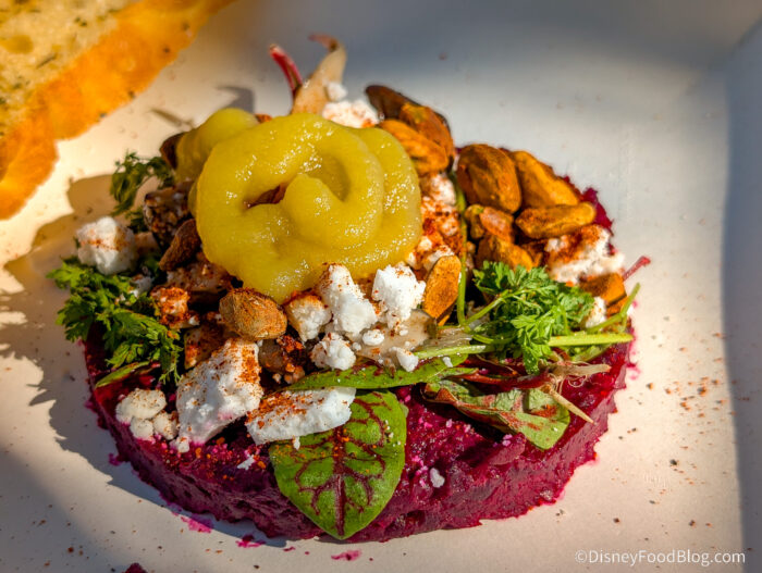 This dish comes with golden beet “egg yolk,” mustard vinaigrette, pickled mustard seeds, pickled mushrooms, spiced pistachios, and “feta” snow. It is a plant-based item, and is part of the Wonderful Walk of Colorful Cuisine Item. The Wonderful Walk of Colorful Cuisine is essentially a food challenge where, if you buy 5 of the 7 participating items, you can get a FREE prize.