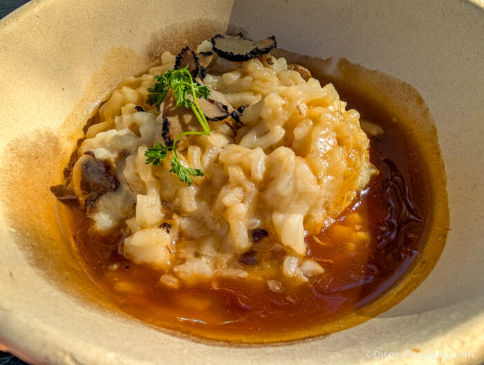 In the past, this was our favorite item at this booth! It’s plant-based, so that “parmesan” is really a coconut-based “cheese.” The dish was salty, delicious, creamy, and earthy. We even had to double-check with Cast Members that it is actually plant-based, as it is super creamy!