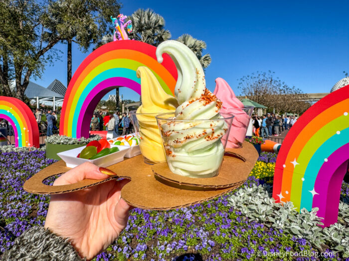Returning items include the adorable Imagination Cone made with pink vanilla soft-serve in a lavender cone, “sparks” of imagination, and white chocolate Figment wings; and the Candy Trio Flight made with DOLE Whip Strawberry with STARBURST MINIS fruit chews, DOLE Whip Lemon with SKITTLES POP’d Original Freeze Dried Candy, DOLE Whip Lime with chili-lime seasoning and LIFE SAVERS gummies.