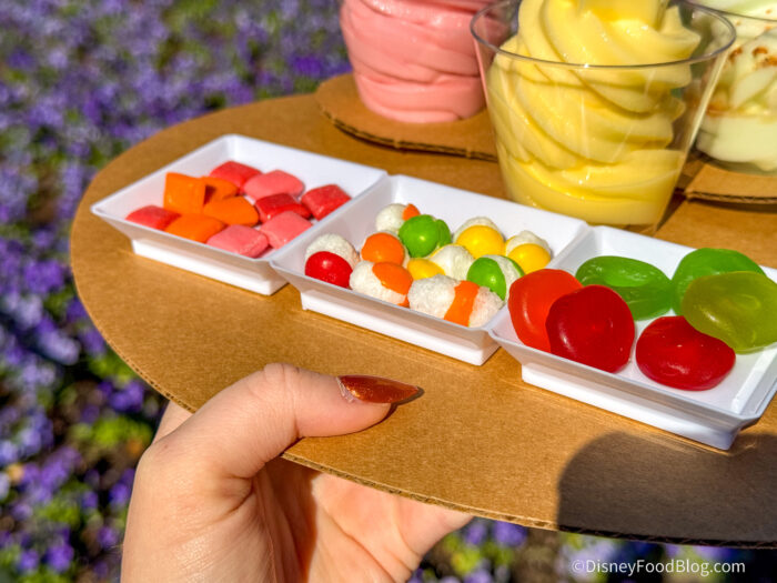 We added the candies on top of each other, and well, you’ll want to eat them right away, because if you wait, they get tough and chewy. We think the idea here is great, but as a whole, the candies with the DOLE Whip make the whole thing a little unwieldy.