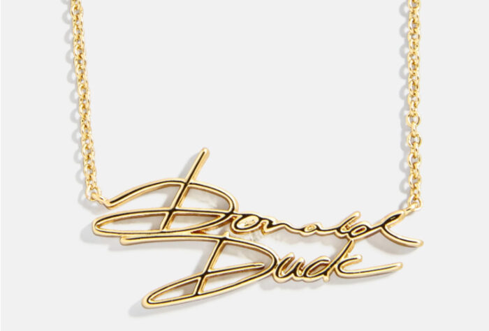 Available in Mickey, Minnie, Daisy, and Donald versions, the Disney Character Signature Necklace features the autograph of the Disney character of your choice, set in a gold color scheme and elegantly designed in their own “handwriting.”