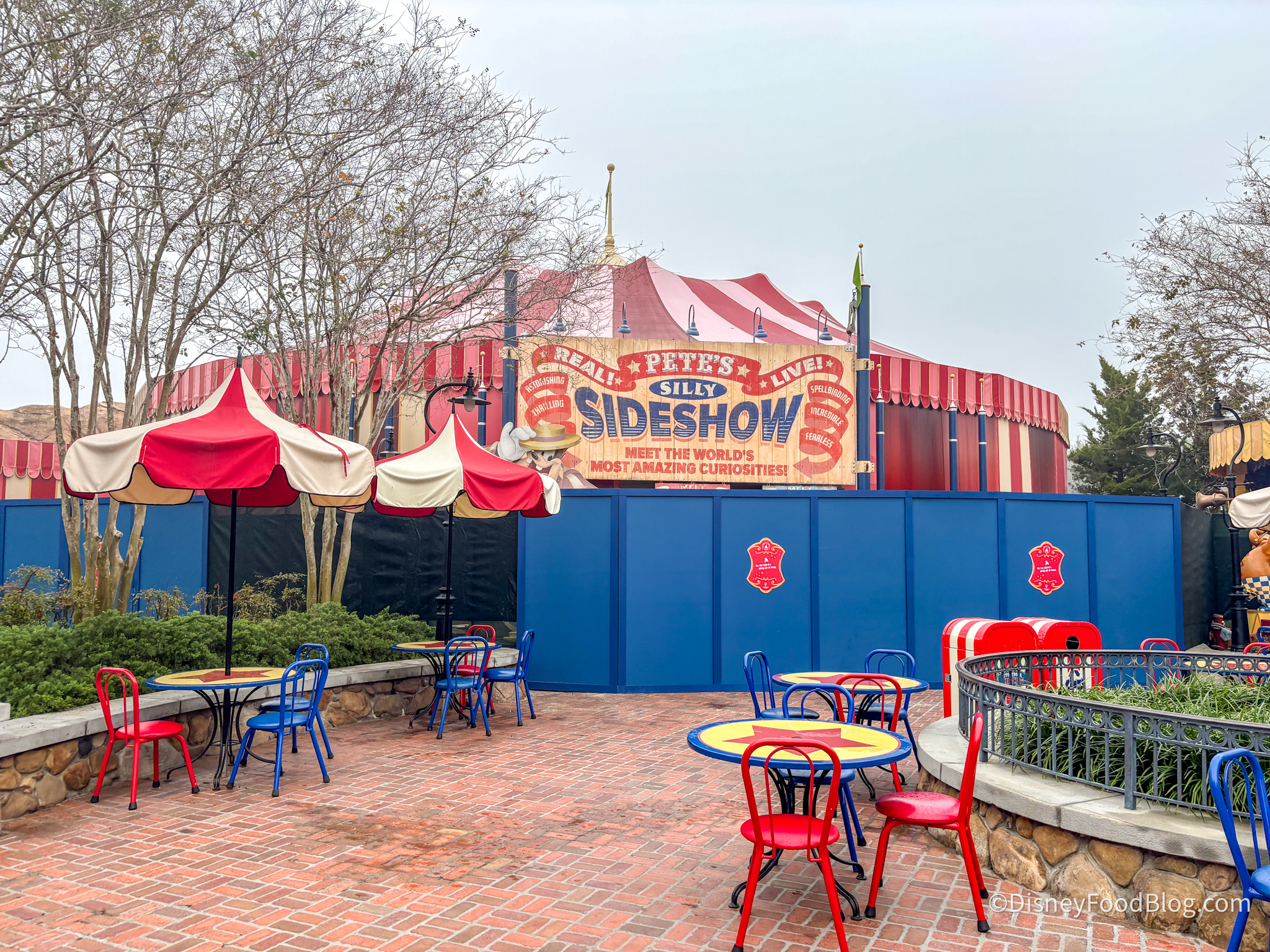 Pete’s Silly Sideshow is temporarily unavailable as of January 4th, 2026. This is the Storybook Circus meet and greet area, where you can meet Donald Duck, Goofy, Daisy Duck, and Minnie Mouse as they join the circus.