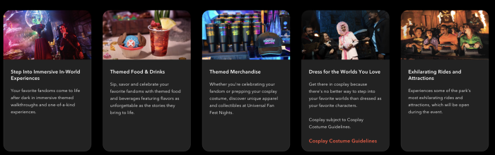 - Universal Fan Fest Nights Universal Express Add-On: begins at $70 per person (must be added onto an existing ticket)