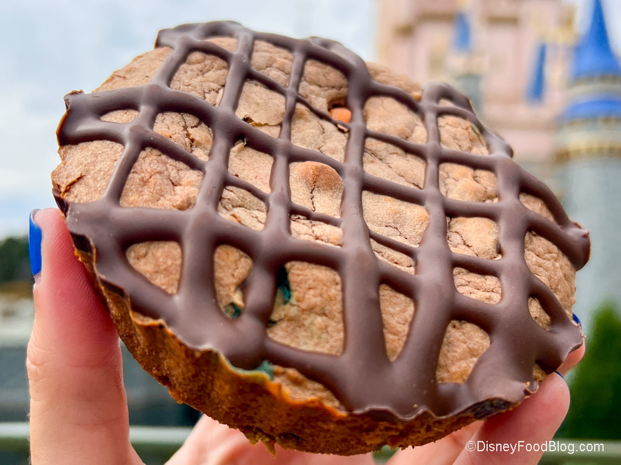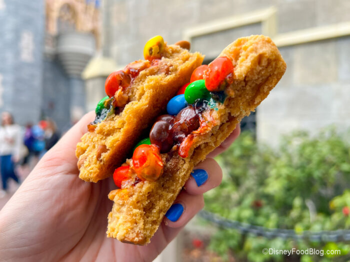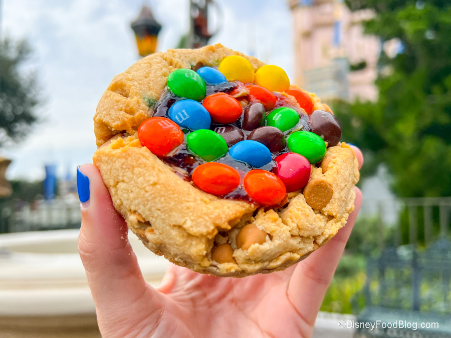 The first new treat is the Peanut Butter and Jelly Cookie Pie with M&M’s Peanut Butter Chocolate Candies for $7.79. It also has peanut butter frosting and strawberry jelly. So the idea here is to really tap into those nostalgic childhood vibes, and we think Disney was successful in doing just that. The texture is exactly like a thick peanut butter cookie, and there are even additional peanut butter chips in it, which we loved. Then you’ve got those peanut butter M&Ms, so this is for everyone who loves peanut butter.