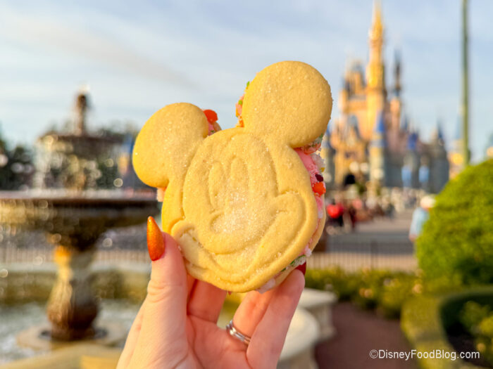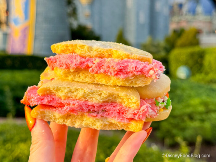Finally, we have to talk about the Mickey Strawberry Cookie Sandwich with SKITTLES POP’d Original Freeze Dried Candy for $7.99. First, why is Disney putting freeze-dried Skittles on EVERYTHING right now? This is seriously a weird trend, although we get that kids LOVE it. But let’s talk about the snack as a whole. The sugar cookies were firm and not crumbly, which kinda made them hard to bite into. So this is already testing our patience in just trying to eat it.