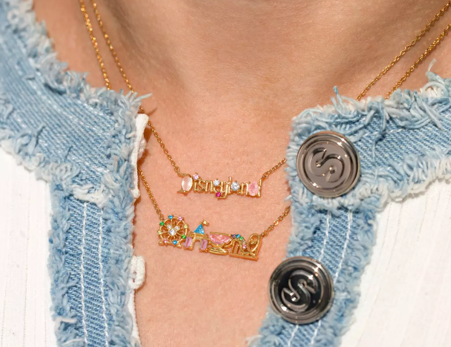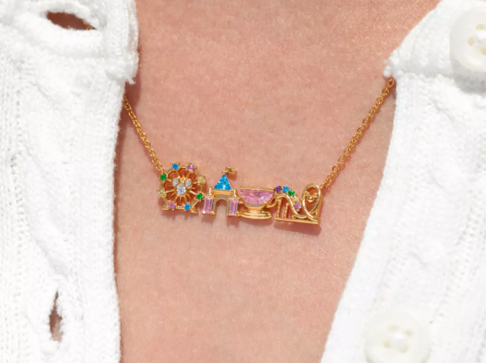 The Disney World version of this necklace has already sold out, but you can still snag the Disneyland Attractions Necklace by Girls Crew. It pays homage to some of Disneyland Resort’s most iconic offerings, like Incredicoaster, Mad Tea Party, and Sleeping Beauty Castle.