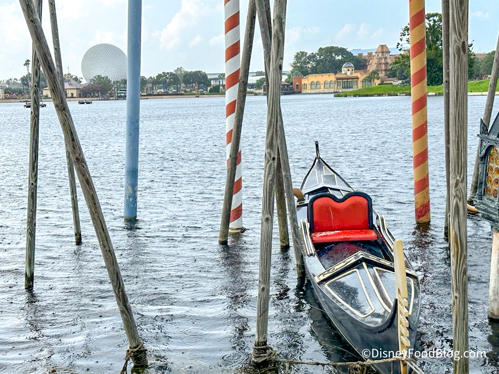 So, the Italy pavilion is one of the World Showcase pavilions that doesn’t feature a ride or attraction. Now, there IS a gondola in the water outside the pavilion, with placemaking elements reminiscent of Venice. However, the boat is just a placemaking prop, not something that guests can ride or even get in.