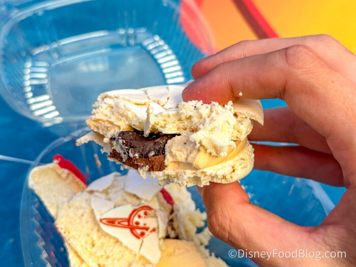 The Moonliner Macaron is available at Alien Pizza Planet for $8.79. It’s a rocket-shaped macaron shell filled with salted caramel buttercream, chocolate ganache, and brownie pieces. Then it’s topped with a white chocolate Pizza Planet logo. This macaron is adorable – even if we didn’t love the taste, we’d still give it bonus points for how cute it is, but luckily, it tastes even better than it looks!