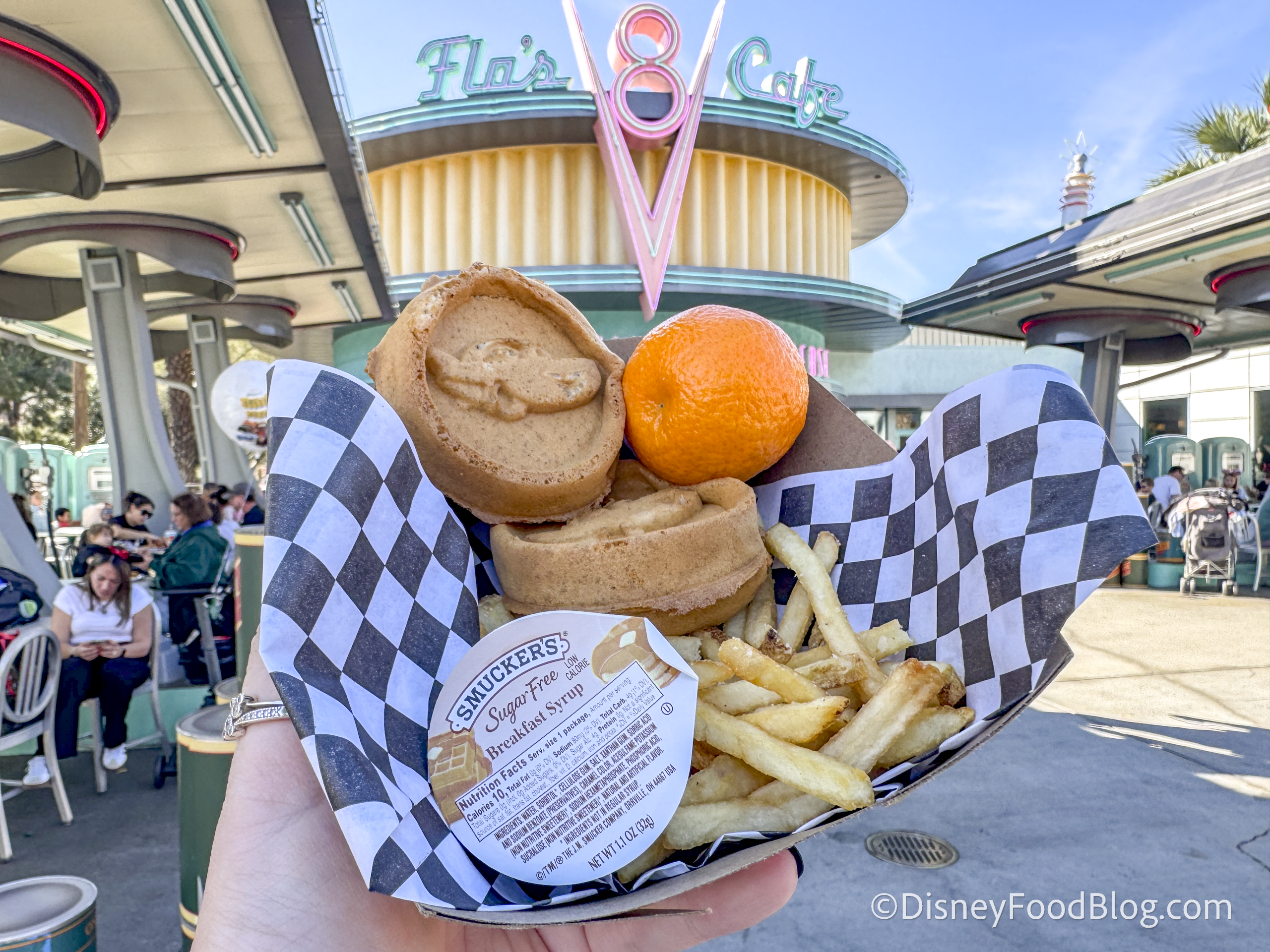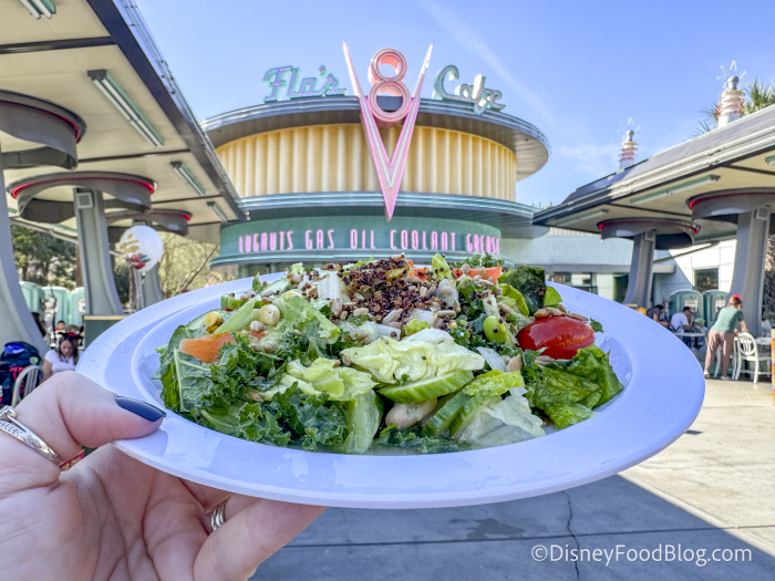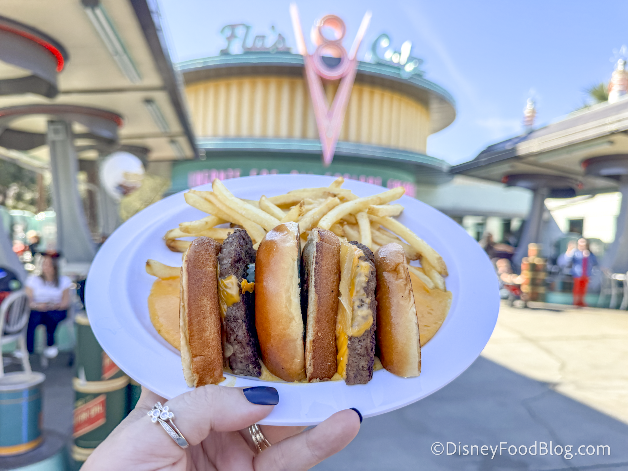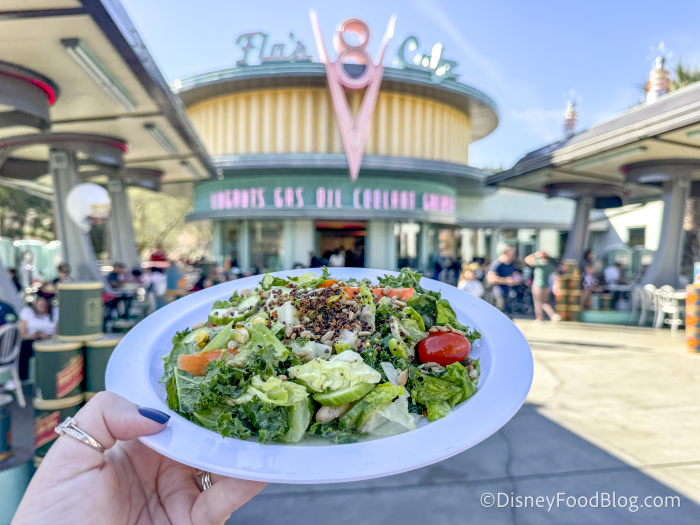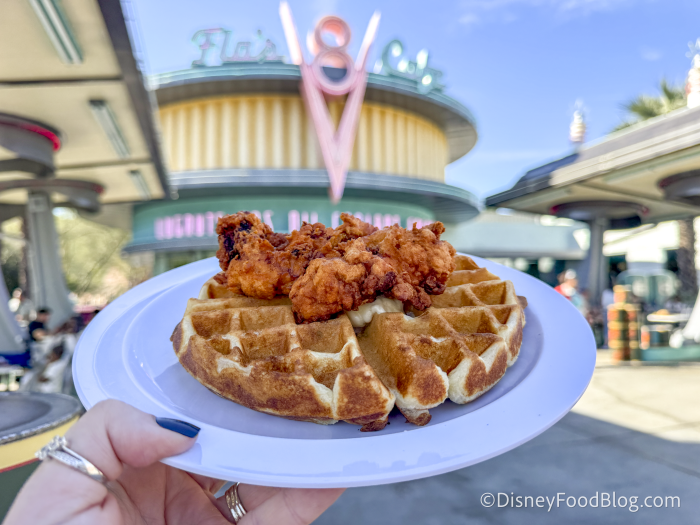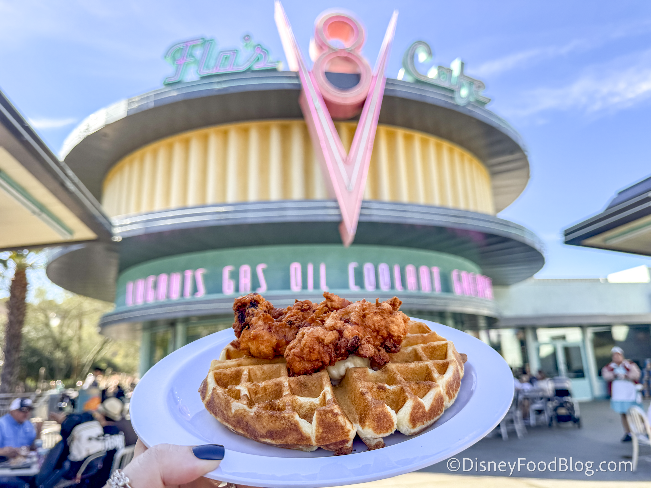 Flo’s V8 Cafe is located in Cars Land in Disney California Adventure. It is inspired by the mom-and-pop diners you can find along Route 66. The restaurant resembles a giant air filter! The dining room is fashioned after a showroom and serves as a museum of artifacts from the legendary race car driver, Doc Hudson. Let’s dig into the new menu items!