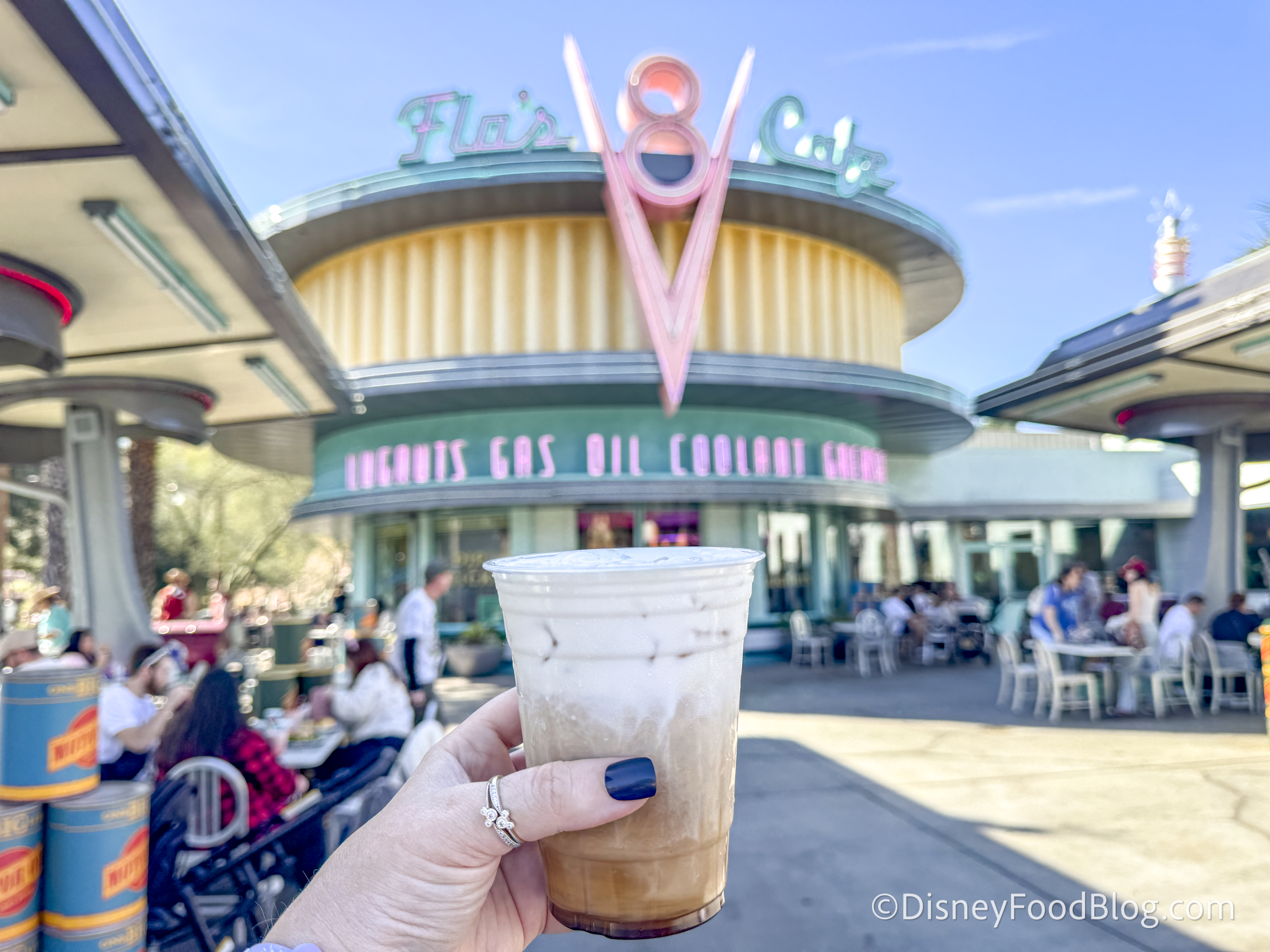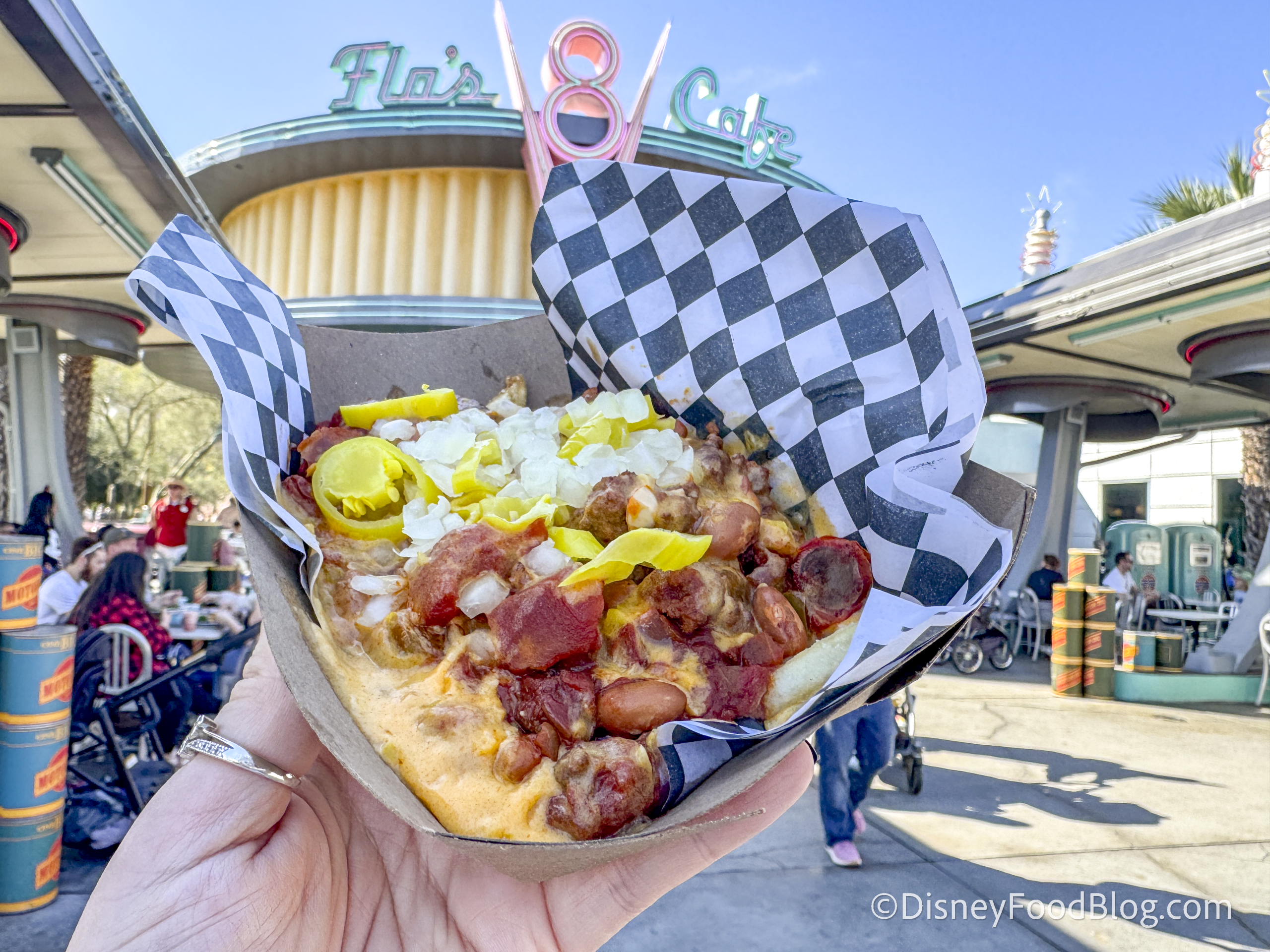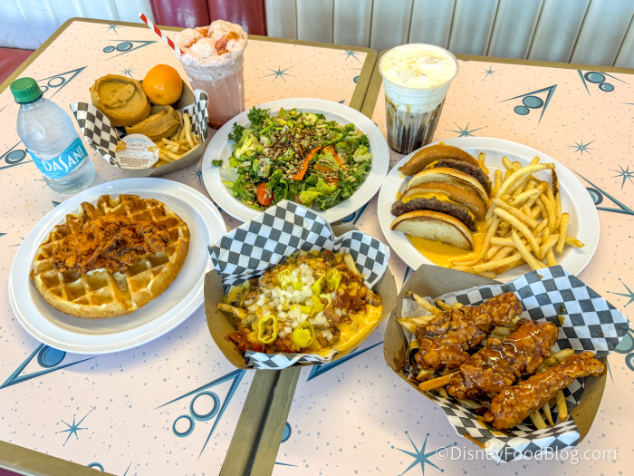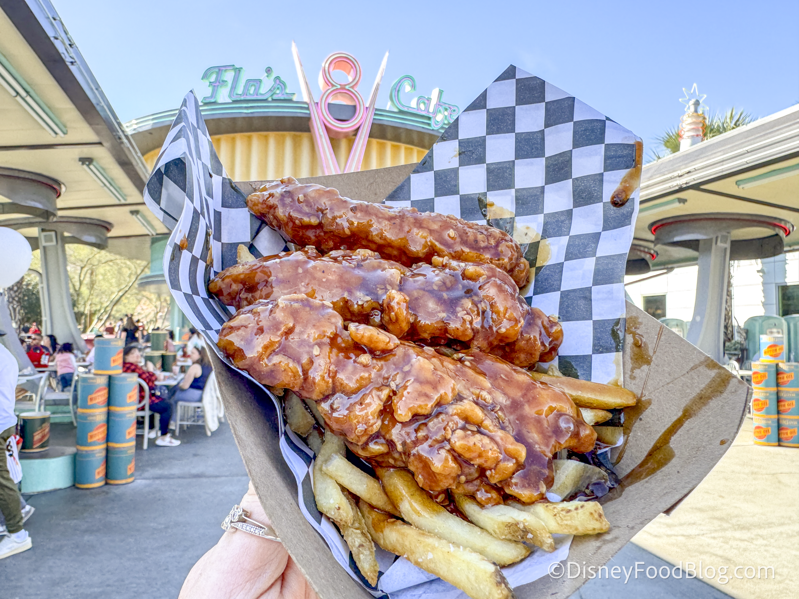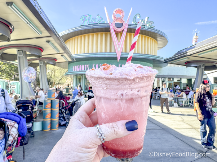 Flo’s V8 Cafe is located in Cars Land in Disney California Adventure. It is inspired by the mom-and-pop diners you can find along Route 66. The restaurant resembles a giant air filter! The dining room is fashioned after a showroom and serves as a museum of artifacts from the legendary race car driver, Doc Hudson. Let’s dig into the new menu items!