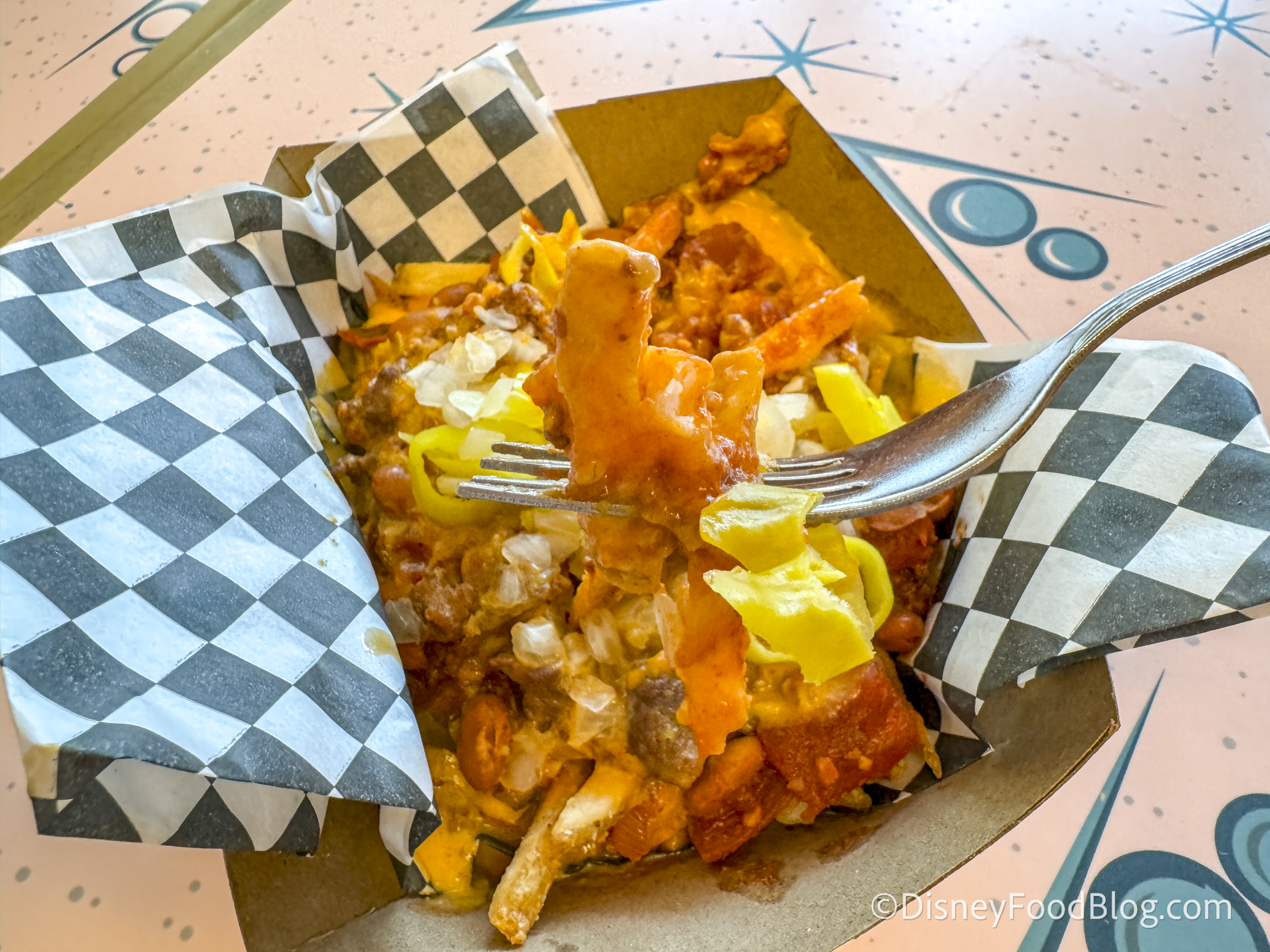 The chili is thick, chunky, hearty, and packed with flavor. The pepperoncinis add a great bit of spice to this dish, along with the cheese sauce. We wish there were a bit more fries, though. The spice is tangy, but not too overpowering. It does linger a bit, so if you don’t like spice at all, you probably won’t like this dish.