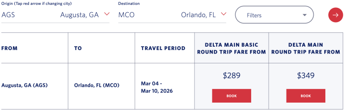Delta’s Orlando deals currently list sample itineraries (including some routes showing low to mid $300s roundtrip ranges on select dates).