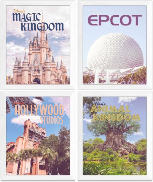 How magical are these vintage-inspired park icon posters?! This set of four includes unframed prints of Magic Kingdom, EPCOT, Hollywood Studios, and Animal Kingdom, and the retro aesthetic captures the timeless charm of Disney World parks. The images are printed on durable, high-resolution paper for vivid cover and detail. All you need are the frames!