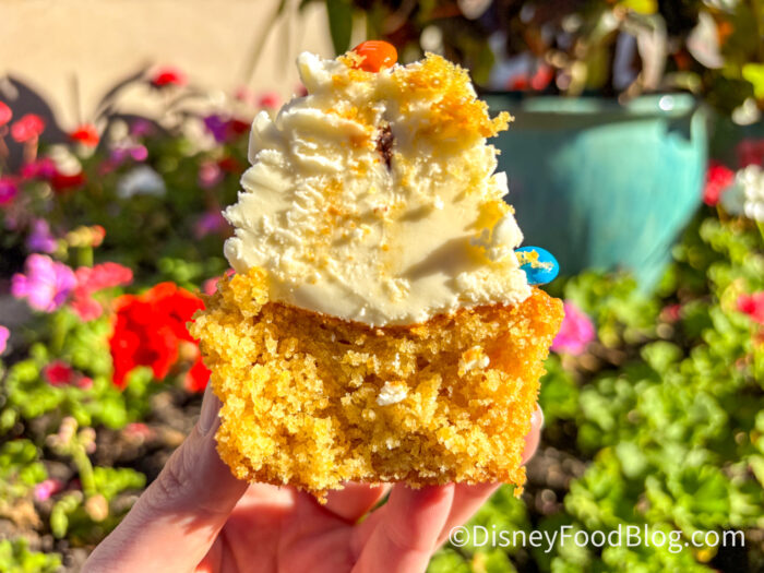 The first one we tried was the Mickey Cereal Cupcake for $6.99. It was a cereal-flavored cupcake with buttercream frosting and dark chocolatey ears, topped with M&M’s Milk Chocolate Minis.