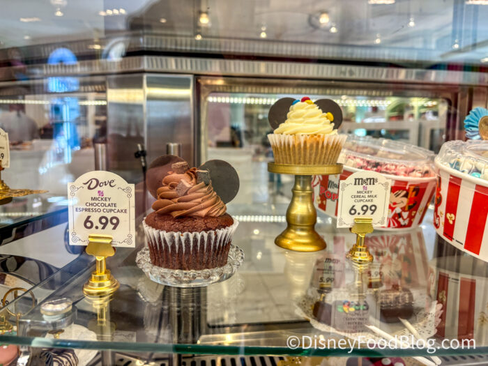The Main Street Confectionery at Magic Kingdom just dropped two new cupcakes — the Mickey Cereal Cupcake and the Mickey Espresso Cupcake! We were intrigued by both of them from their name and the way they looked in that shiny case.