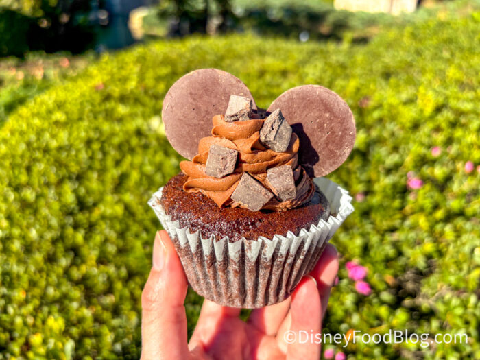 Then we tried the Mickey Espresso Cupcake for $6.99. It was a chocolate cupcake with espresso-flavored buttercream frosting, dark Chocolatey ears, and DOVE Chocolate Pieces on top.