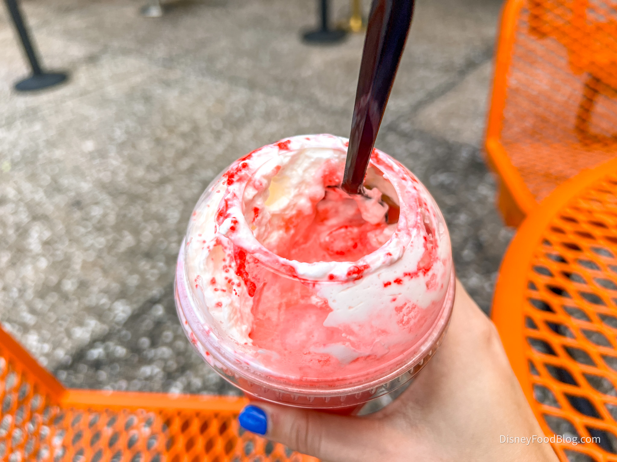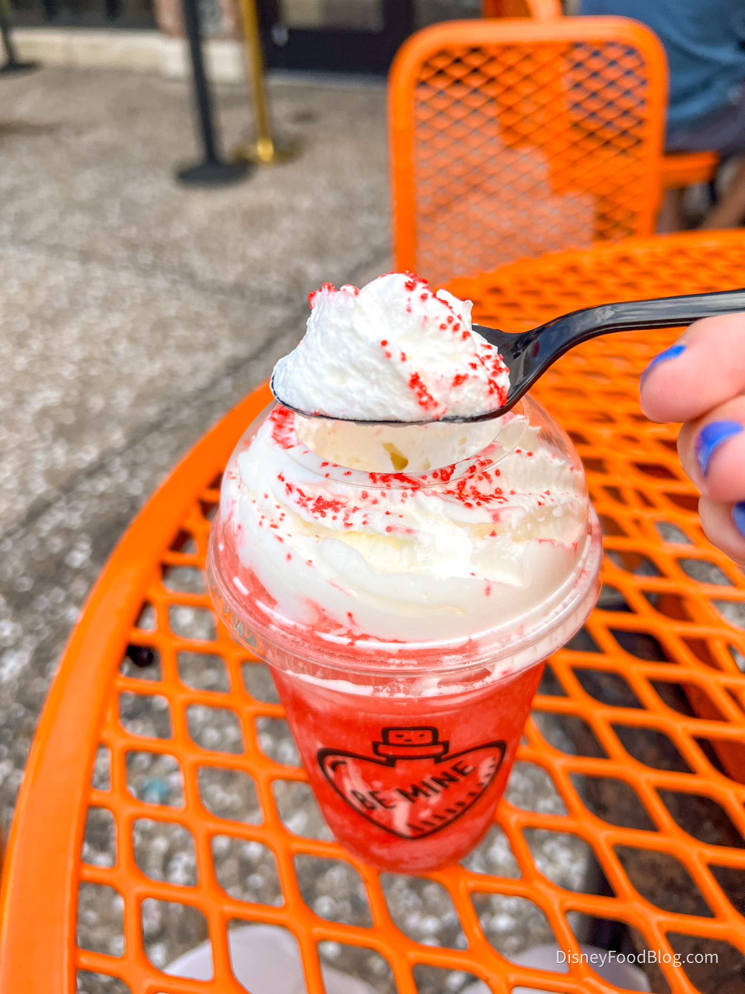 Available at Vivoli il Gelato – the family-owned Disney Springs outpost of one of the oldest gelaterías in Florence, Italy, Vivoli’s, which has been scooping out homemade ice cream since 1930 – the $13.00 Love Potion is a milkshake-style drink that contains vanilla gelato, Strawberry Fanta, whipped cream, and sprinkles.
